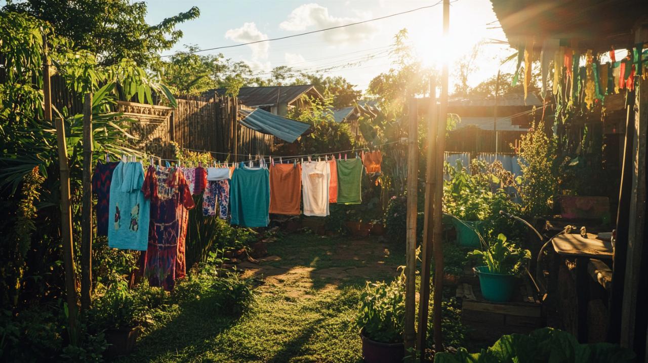 El viento constituye otro aliado natural del secado eficiente. Las corrientes de aire constantes pero moderadas favorecen la evaporación del agua sin maltratar las prendas. Conviene evitar ubicaciones completamente resguardadas donde el aire permanece estancado, así como zonas excesivamente expuestas donde vientos fuertes puedan desgarrar la ropa o desestabilizar la estructura. Observar la dirección predominante de las brisas durante diferentes estaciones permite orientar las cuerdas perpendicularmente al flujo de aire, maximizando el efecto de secado. La proximidad a árboles debe evaluarse cuidadosamente, ya que proporcionan sombra refrescante pero también pueden soltar polen, resina o pequeñas ramas sobre la ropa limpia.