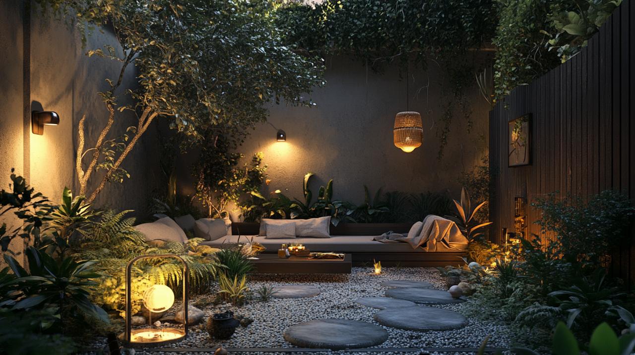 La iluminación transforma el patio exterior durante la noche, creando atmósferas mágicas y funcionales. Combinar diferentes tipos de luces permite lograr efectos variados según la ocasión. Las velas y faroles aportan calidez y romanticismo, perfectos para cenas íntimas o momentos de relax. Las guirnaldas de luces, colgadas sobre la zona de comedor o a lo largo de las paredes, generan un ambiente festivo y acogedor. Las luces solares son una alternativa sostenible y práctica, especialmente cuando no hay acceso fácil a puntos eléctricos; se cargan durante el día y se encienden automáticamente al anochecer. Los focos empotrados en el suelo o en muros iluminan zonas específicas, como caminos o rincones de vegetación, añadiendo seguridad y resaltando elementos decorativos. La iluminación LED es eficiente y versátil, disponible en diferentes tonalidades que permiten ajustar el ambiente según el momento. Colocar las luces de manera estratégica, evitando el deslumbramiento directo y destacando las áreas clave, maximiza tanto la funcionalidad como la belleza del espacio.